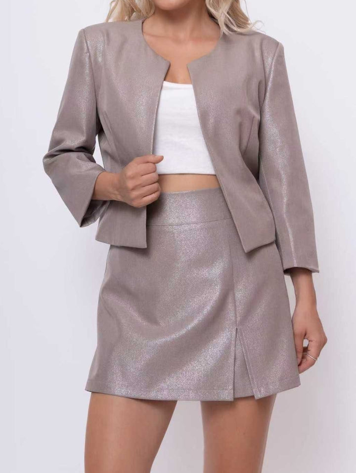 Questa giacca corta a manica lunga con effetto laminato offre un tocco glam perfetto per diverse occasioni, garantendo un look elegante e adattabile. La vestibilità è conforme alle misure standard. Prodotta in Italia con attenzione alla qualità.